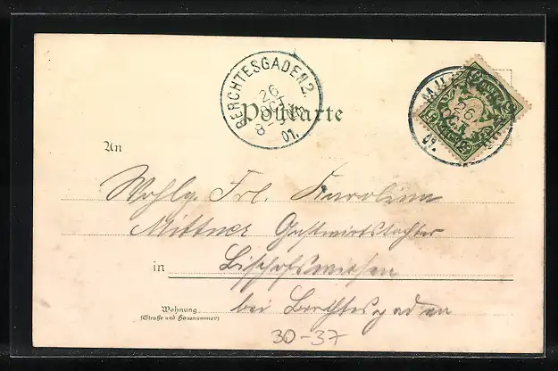 Personenbezogene Daten auf der Rückseite der Karte wurden durch blauen Textmarker unkenntlich gemacht. Die blauen Stellen sind auf die Vorderseite durchgeweicht und wirken sich negativ auf das Postkartenfoto aus