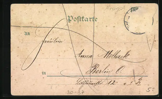 Personenbezogene Daten auf der Rückseite der Karte wurden durch blauen Textmarker unkenntlich gemacht. Die blauen Stellen sind auf die Vorderseite durchgeweicht und wirken sich negativ auf das Postkartenfoto aus
