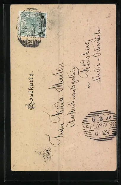 Personenbezogene Daten auf der Rückseite der Karte wurden durch blauen Textmarker unkenntlich gemacht. Die blauen Stellen sind auf die Vorderseite durchgeweicht und wirken sich negativ auf das Postkartenfoto aus