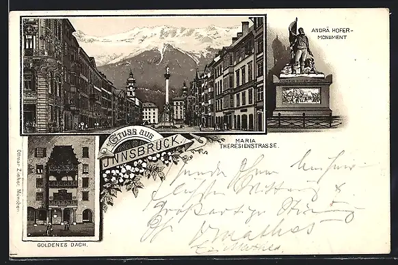 Lithographie Innsbruck, Ortspartie mit Denkmal, Andrä Hofer-Monument, Goldenes Dach, Alpen