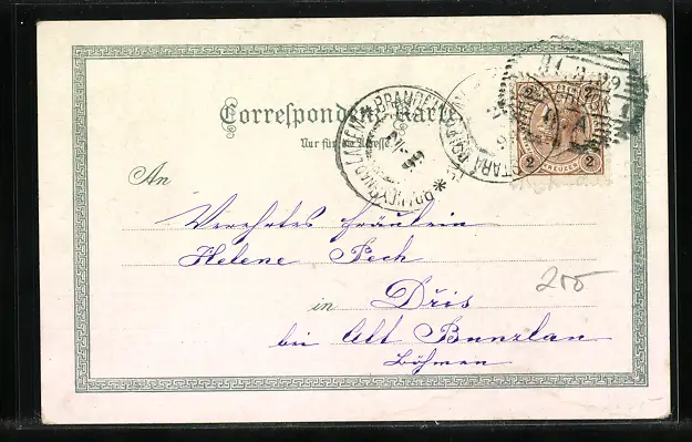 Personenbezogene Daten auf der Rückseite der Karte wurden durch blauen Textmarker unkenntlich gemacht. Die blauen Stellen sind auf die Vorderseite durchgeweicht und wirken sich negativ auf das Postkartenfoto aus