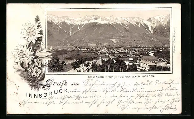 Lithographie Innsbruck, Totalansicht nach Norden mit Alpenpanorama