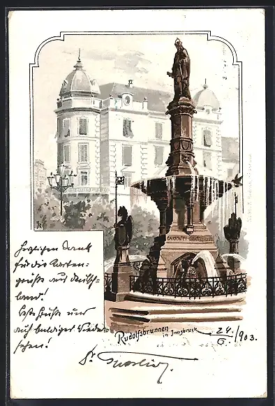 Lithographie Innsbruck, am Rudolfsbrunnen