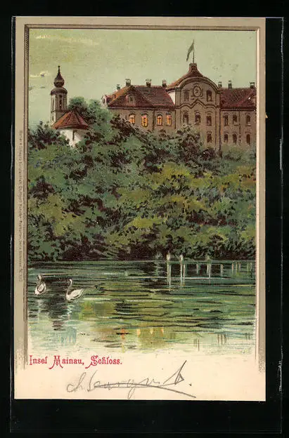 Lithographie Insel Mainau, Abendstimmung am Schloss