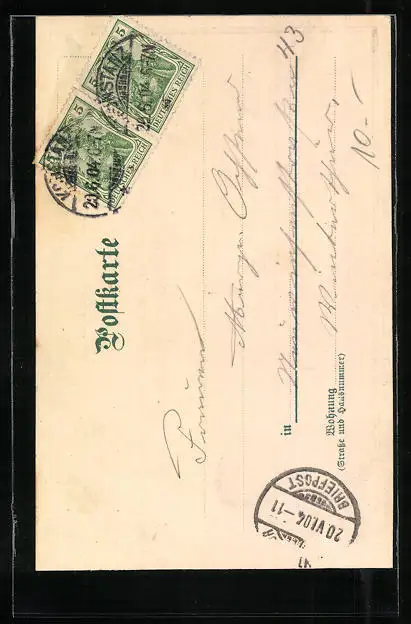 Personenbezogene Daten auf der Rückseite der Karte wurden durch blauen Textmarker unkenntlich gemacht. Die blauen Stellen sind auf die Vorderseite durchgeweicht und wirken sich negativ auf das Postkartenfoto aus