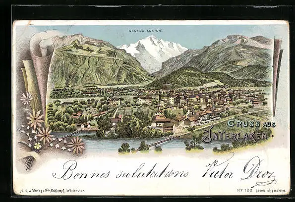 Lithographie Interlaken, Generalansicht aus der Vogelschau