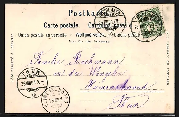 Personenbezogene Daten auf der Rückseite der Karte wurden durch blauen Textmarker unkenntlich gemacht. Die blauen Stellen sind auf die Vorderseite durchgeweicht und wirken sich negativ auf das Postkartenfoto aus