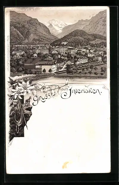 Lithographie Interlaken, Panorama, Wanderausrüstung