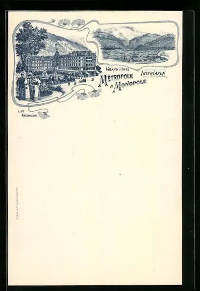 Lithographie Interlaken, Partie am Grand Hotel Métropole & Monopole, Ortsansicht