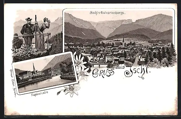 Lithographie Ischl, Ortsansicht von oben, Esplanade, Frau mit Fernglas