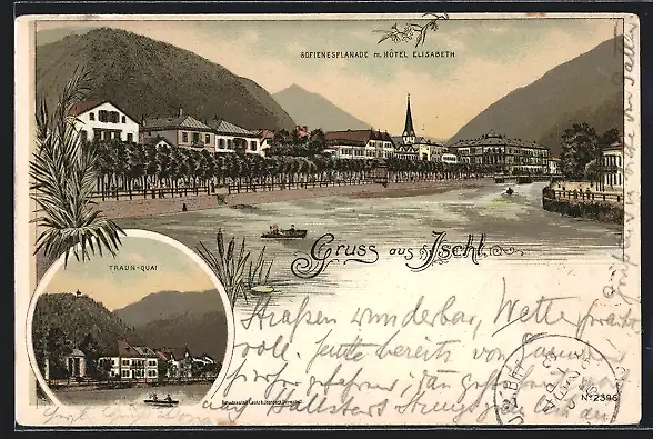 Lithographie Ischl, Sofienesplanade mit Hotel Elisabeth, Traun-Quai