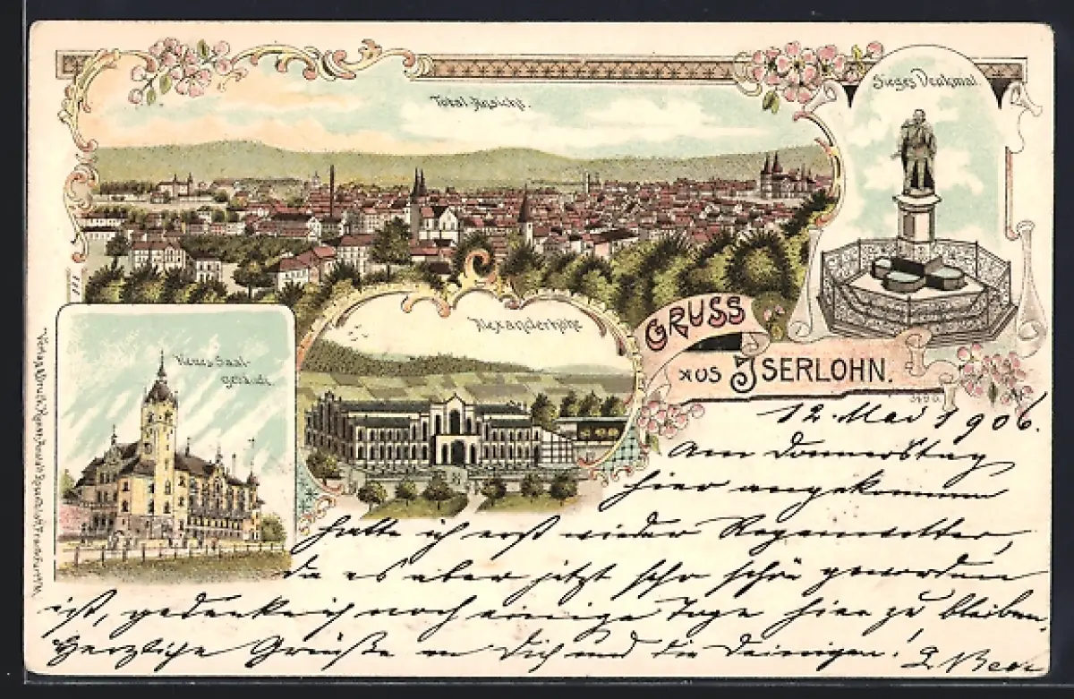 Lithographie Iserlohn, Alexanderhöhe, Siegesdenkmal und neues Saalgebäude