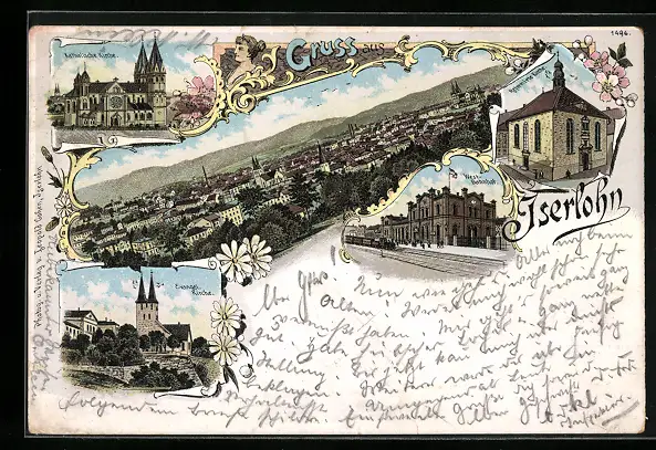 Lithographie Iserlohn, Kath. Kirche, Evang. Kirche, Westbahnhof