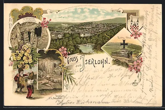 Lithographie Iserlohn, Orgelgrotte i. d. Dechenhöhle, Nixengrotte, Eisernes Kreuz