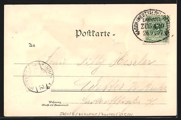 Personenbezogene Daten auf der Rückseite der Karte wurden durch blauen Textmarker unkenntlich gemacht. Die blauen Stellen sind auf die Vorderseite durchgeweicht und wirken sich negativ auf das Postkartenfoto aus