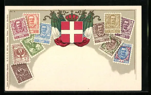 Lithographie Italien, Briefmarken und Wappen mit Krone und Flagge