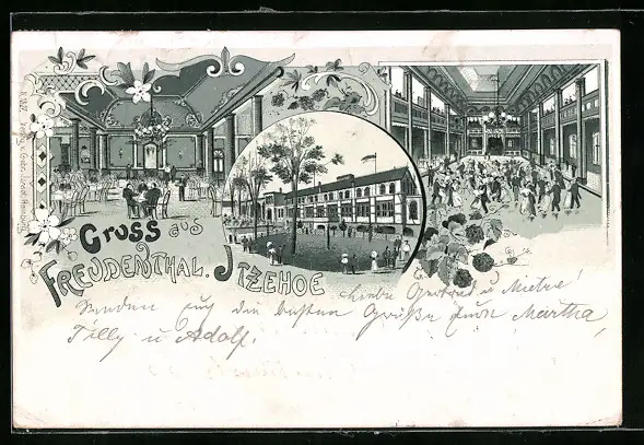 Lithographie Itzehoe, Gasthaus Freudenthal, Innen- und Aussenansichten