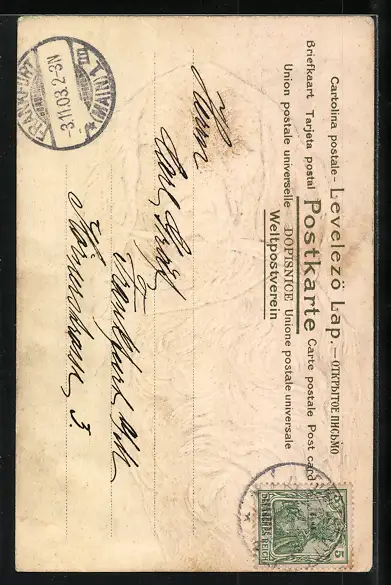 Personenbezogene Daten auf der Rückseite der Karte wurden durch blauen Textmarker unkenntlich gemacht. Die blauen Stellen sind auf die Vorderseite durchgeweicht und wirken sich negativ auf das Postkartenfoto aus