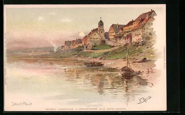 Lithographie Jagstfeld, Uferpartie mit Booten