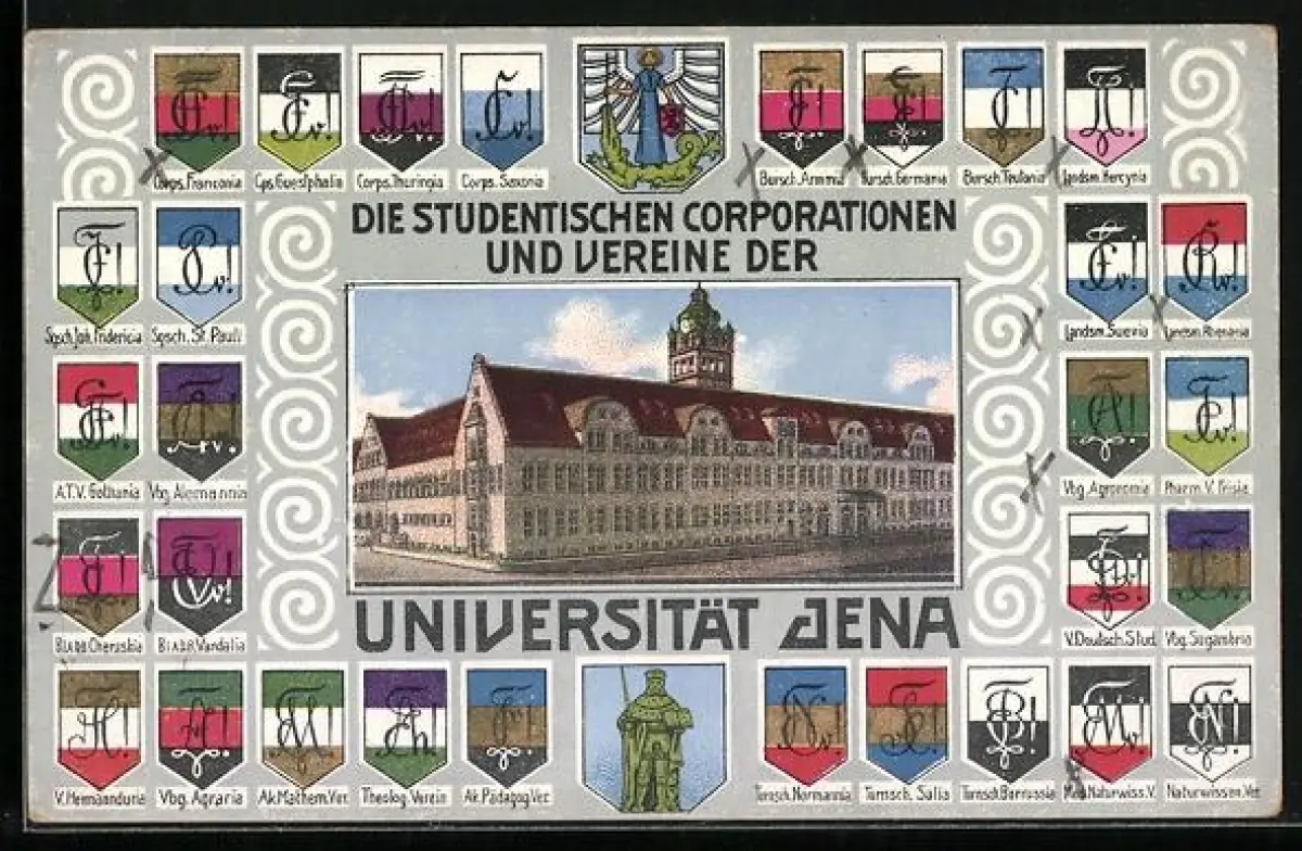 Lithographie Jena, Ansicht der Universität, Studentenwappen