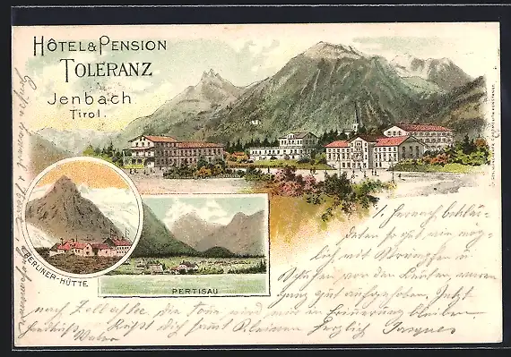 Lithographie Jenbach, Totalansicht mit Berliner-Hütte