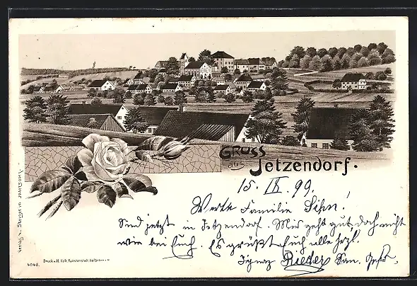 Lithographie Jetzendorf, Ortsansicht mit Rosenblüte