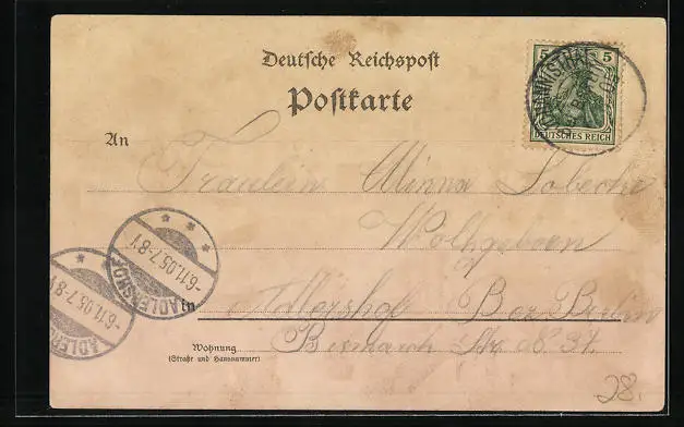Personenbezogene Daten auf der Rückseite der Karte wurden durch blauen Textmarker unkenntlich gemacht. Die blauen Stellen sind auf die Vorderseite durchgeweicht und wirken sich negativ auf das Postkartenfoto aus