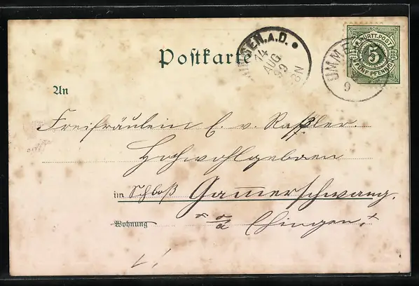 Personenbezogene Daten auf der Rückseite der Karte wurden durch blauen Textmarker unkenntlich gemacht. Die blauen Stellen sind auf die Vorderseite durchgeweicht und wirken sich negativ auf das Postkartenfoto aus