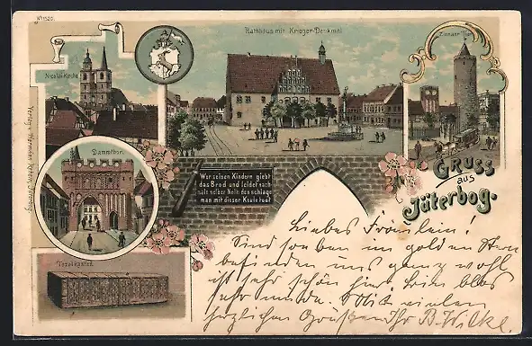 Lithographie Jüterbog, Dammthor, Nicolaikirche, Rathaus und Kriegerdenkmal, Zinnaer Tor, Tezelkasten