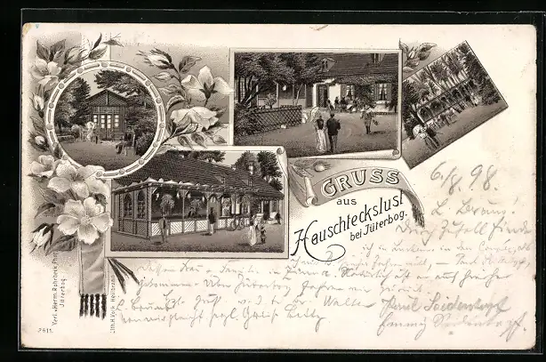 Lithographie Jüterbog, Gasthaus Heuschteckslust mit Besuchern