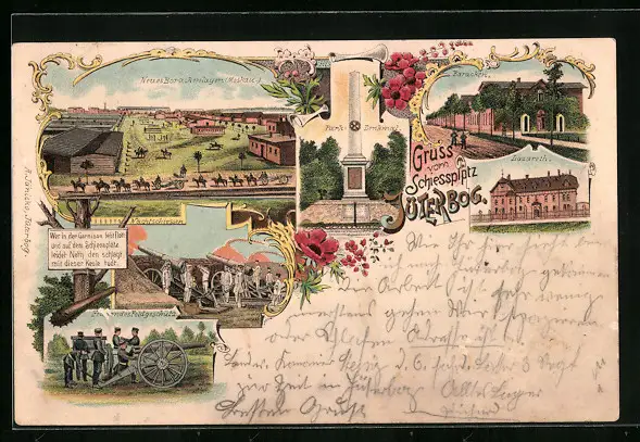 Lithographie Jüterbog, Schiessplatz mit Baracken