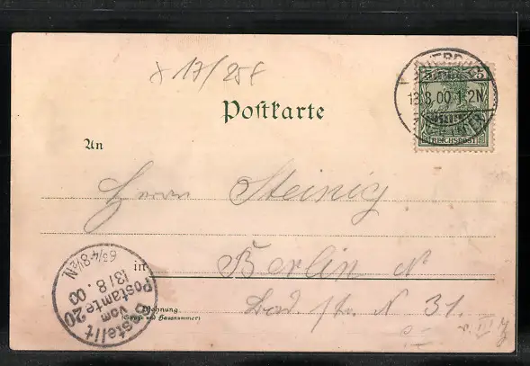 Personenbezogene Daten auf der Rückseite der Karte wurden durch blauen Textmarker unkenntlich gemacht. Die blauen Stellen sind auf die Vorderseite durchgeweicht und wirken sich negativ auf das Postkartenfoto aus