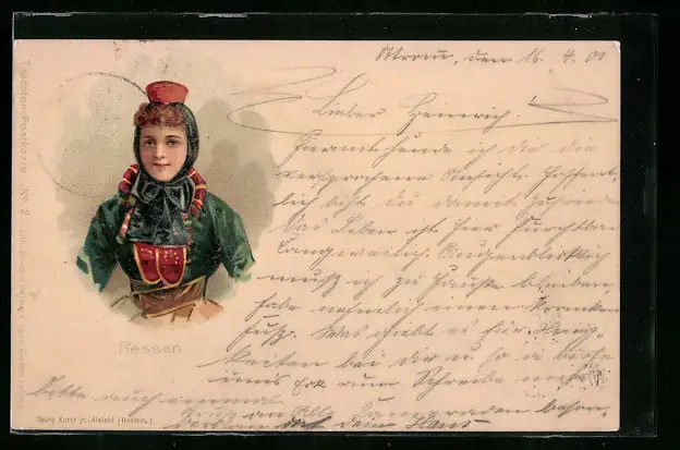 Lithographie Junge hessische Frau in Tracht