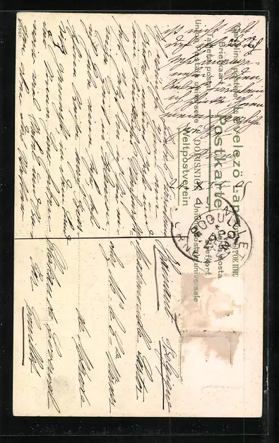 Personenbezogene Daten auf der Rückseite der Karte wurden durch blauen Textmarker unkenntlich gemacht. Die blauen Stellen sind auf die Vorderseite durchgeweicht und wirken sich negativ auf das Postkartenfoto aus