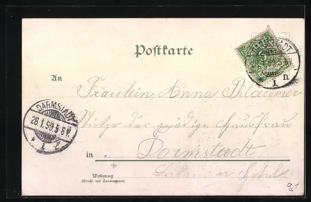 Personenbezogene Daten auf der Rückseite der Karte wurden durch blauen Textmarker unkenntlich gemacht. Die blauen Stellen sind auf die Vorderseite durchgeweicht und wirken sich negativ auf das Postkartenfoto aus