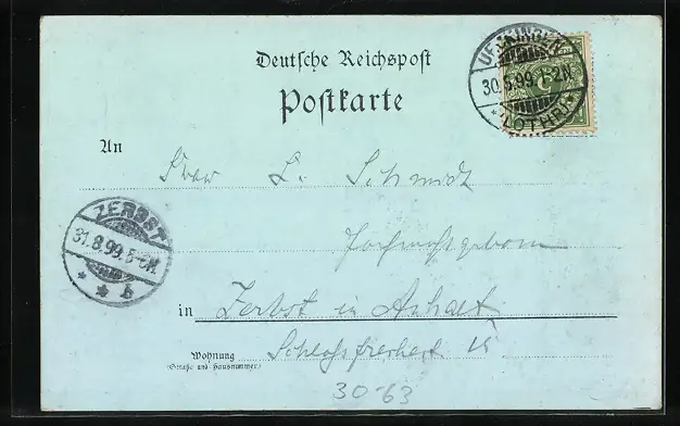 Personenbezogene Daten auf der Rückseite der Karte wurden durch blauen Textmarker unkenntlich gemacht. Die blauen Stellen sind auf die Vorderseite durchgeweicht und wirken sich negativ auf das Postkartenfoto aus