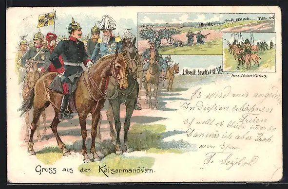 Lithographie Kaisermanöver unter Kaiser Wilhelm II. zu Pferd