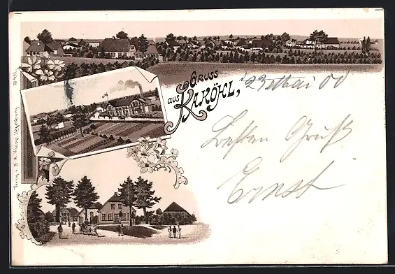 Lithographie Kaköhl, Gasthaus mit Umgebung, Ortspartie, Totalansicht