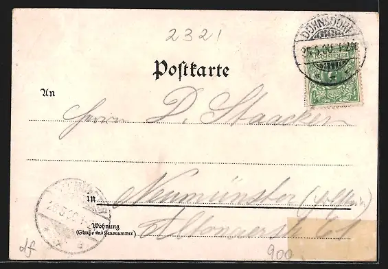 gelaufen 1900, Eckknick unten li. u. oben re., vorder- u. rückseitig Klebe- und Papierreste, guter Zustand