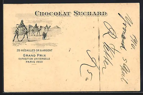Lithographie Kamelkarawane mit einer Ladung Chocolat Suchard