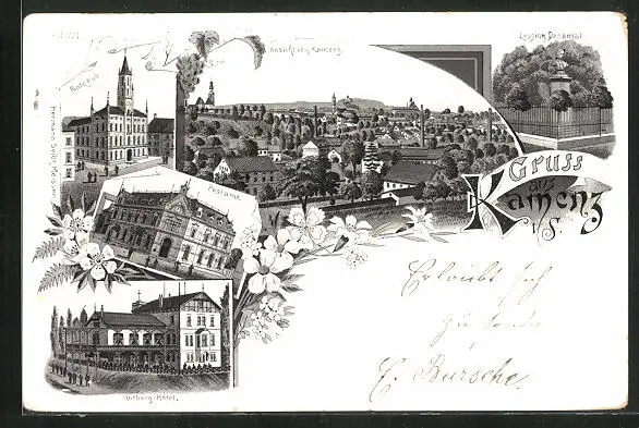 Lithographie Kamenz i. S., Hutberg-Hôtel, Postamt, Rathaus