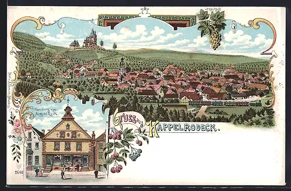 Lithographie Kappelrodeck, Ortsansicht mit Eisenbahn und Handlung von August Roth