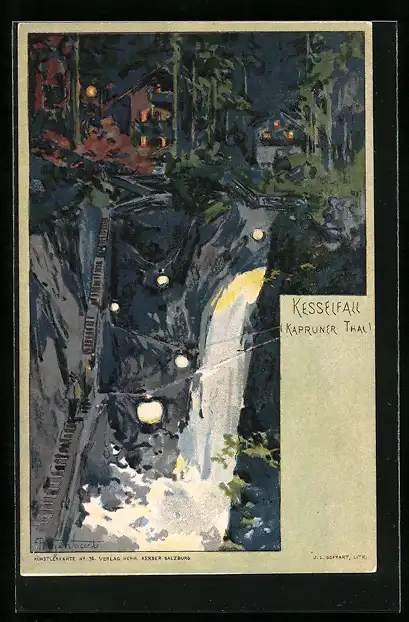 Lithographie Kaprun, Kesselfall bei Nacht