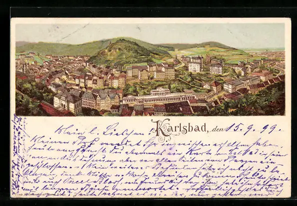 Lithographie Karlsbad, Ansicht Ort mit Bergen