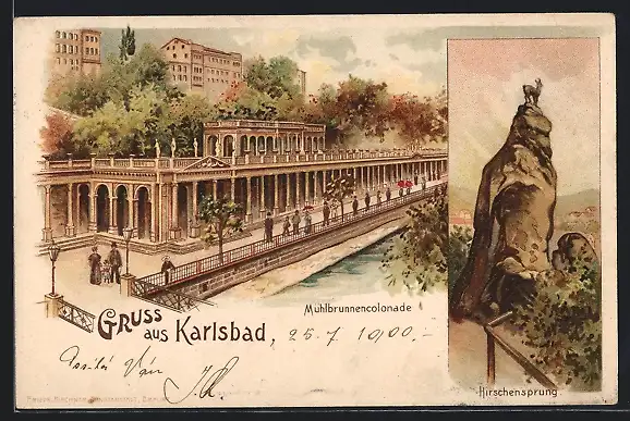 Lithographie Karlsbad, Blick auf die Mühlbrunnencolonade, Hirschensprung