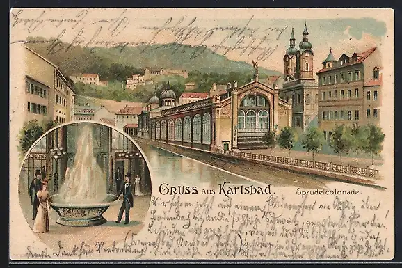 Lithographie Karlsbad, Blick zur Sprudelcolonade