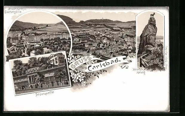 Lithographie Karlsbad, Felsenquelle, Stadtpark und Gartenzeile, Hirschensprung