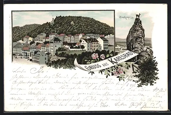 Lithographie Karlsbad, Hirschensprung, Ortsansicht