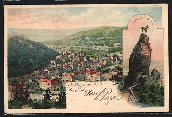 Lithographie Karlsbad, Hirschensprung, Ortsansicht aus der Vogelschau