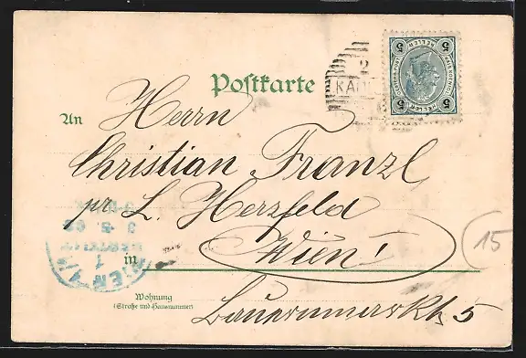 Personenbezogene Daten auf der Rückseite der Karte wurden durch blauen Textmarker unkenntlich gemacht. Die blauen Stellen sind auf die Vorderseite durchgeweicht und wirken sich negativ auf das Postkartenfoto aus